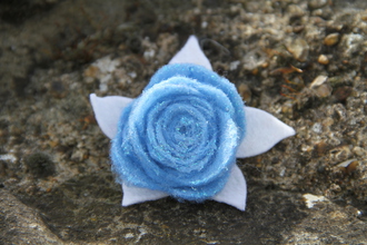 This beautiful hand-made felt rose brooch has all the look of summer. Complete with safety catch fastening. Blue with Blue Glitter and White. Felt with Metal Fastening.