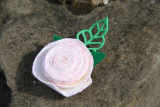 This beautiful hand-made felt rose brooch has all the look of summer. Complete with safety catch fastening. White with Pink Glitter and Green. Felt with Metal Fastening.