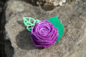 This beautiful hand-made felt rose brooch has all the look of summer. Complete with safety catch fastening. Purple with Purple Glitter and Green. Felt with Metal Fastening.