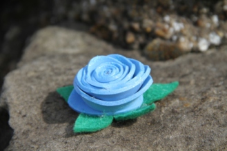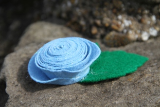 This beautiful hand-made felt rose brooch has all the look of summer. Complete with safety catch fastening. Blue with Blue Glitter and Green. Felt with Metal Fastening.