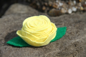 This beautiful hand-made felt rose brooch has all the look of summer. Complete with safety catch fastening. Yellow with Yellow Glitter and Green. Felt with Metal Fastening.