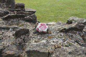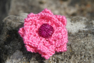 Hand-Knitted Flower brooch with decorative button. Safety catch fastening. Pink flower with dark pink button. Flower: 100% Acrylic.