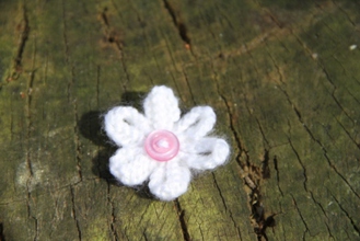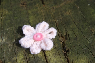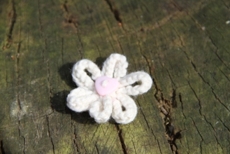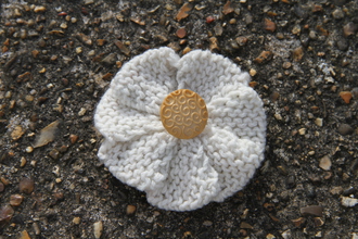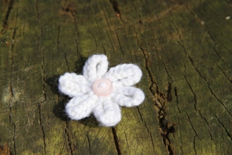 Enjoy the summer all year long with our delicate hand-knitted daisy brooch. Safety pin fastening. White with Pink Button. 100% Acrylic knitted flower.