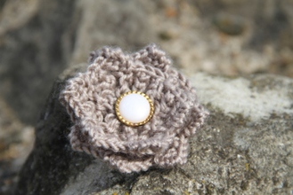 Hand-Knitted Flower brooch with safety catch fastening. White and Brown. Flower: 100% Acrylic.