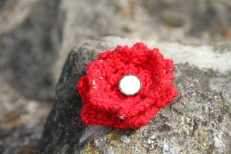 Hand-Knitted Flower brooch with decorative button. Safety catch fastening. Red fleck flower with white and gold coloured button. Flower: 100% Acrylic.