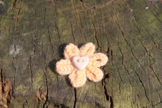 Enjoy the summer all year long with our delicate hand-knitted daisy brooch. Safety pin fastening. Peach with Beige Heart Button. 100% Acrylic knitted flower.