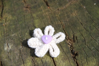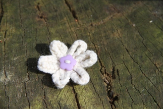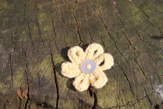 Enjoy the summer all year long with our delicate hand-knitted daisy brooch. Safety pin fastening. Cream with Lilac Flower Button. 100% Acrylic knitted flower.