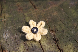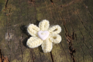 Enjoy the summer all year long with our delicate hand-knitted daisy brooch. Safety pin fastening. Cream with Beige Heart Button. 100% Acrylic knitted flower.