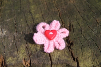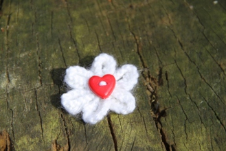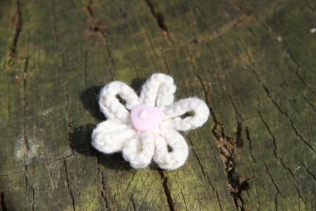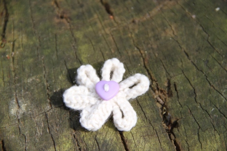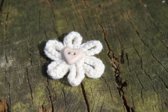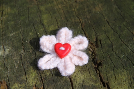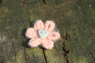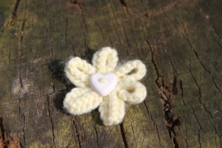 Enjoy the summer all year long with our delicate hand-knitted daisy brooch. Safety pin fastening. Cream with Pink Heart Button. 100% Acrylic knitted flower.
