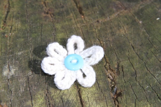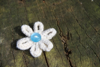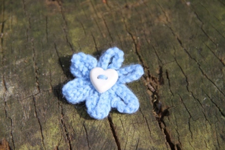 Enjoy the summer all year long with our delicate hand-knitted daisy brooch. Safety pin fastening. Blue with White Button. 100% Acrylic knitted flower.