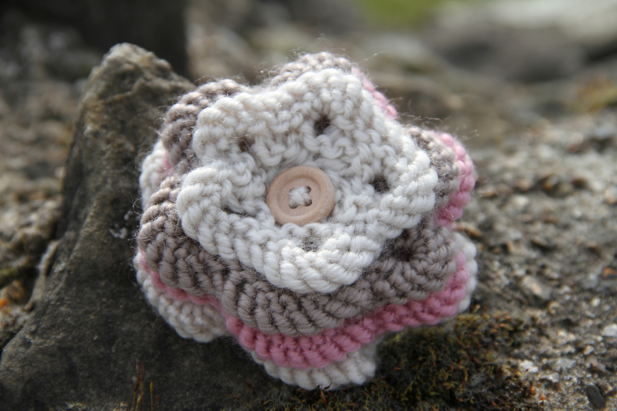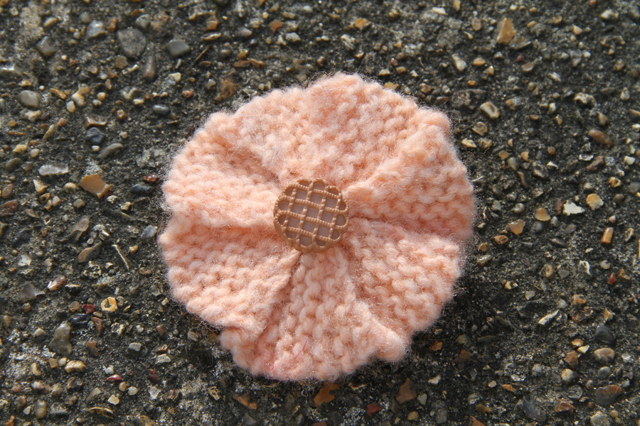 Hand-Knitted Flower brooch with safety catch fastening. Peach & Brown. Flower: 100% Acrylic.
