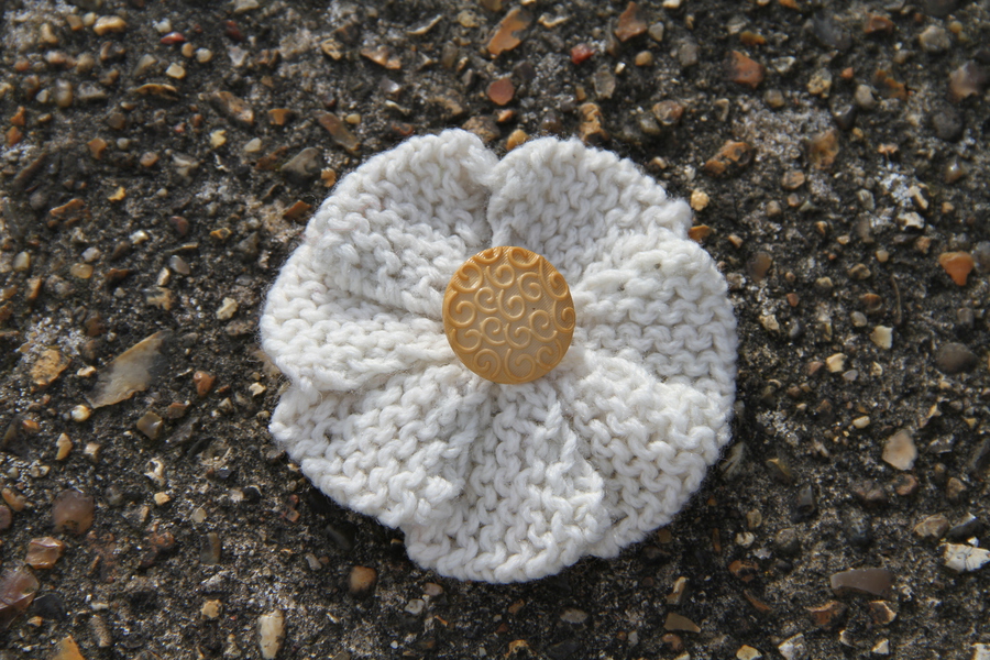 Hand-Knitted Flower brooch with decorative button. Safety catch fastening. Beige flower with white and gold coloured button. Flower: 100% Acrylic.