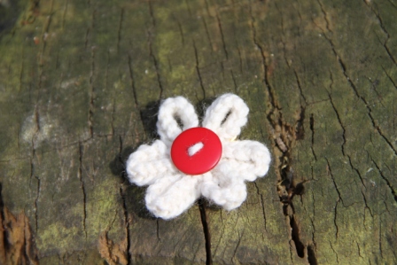 Enjoy the summer all year long with our delicate hand-knitted daisy brooch. Safety pin fastening. White with Red Button. 100% Acrylic knitted flower.